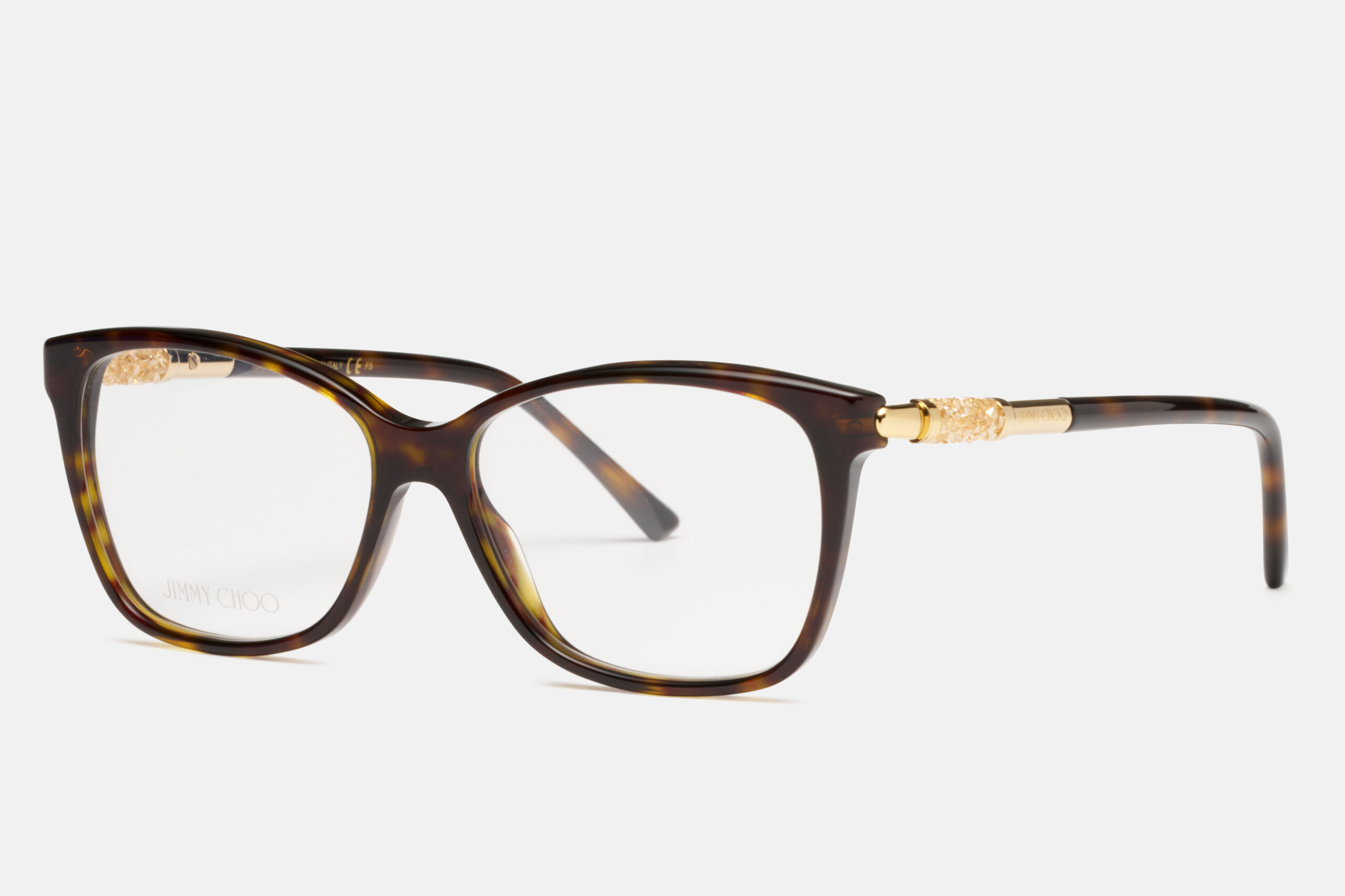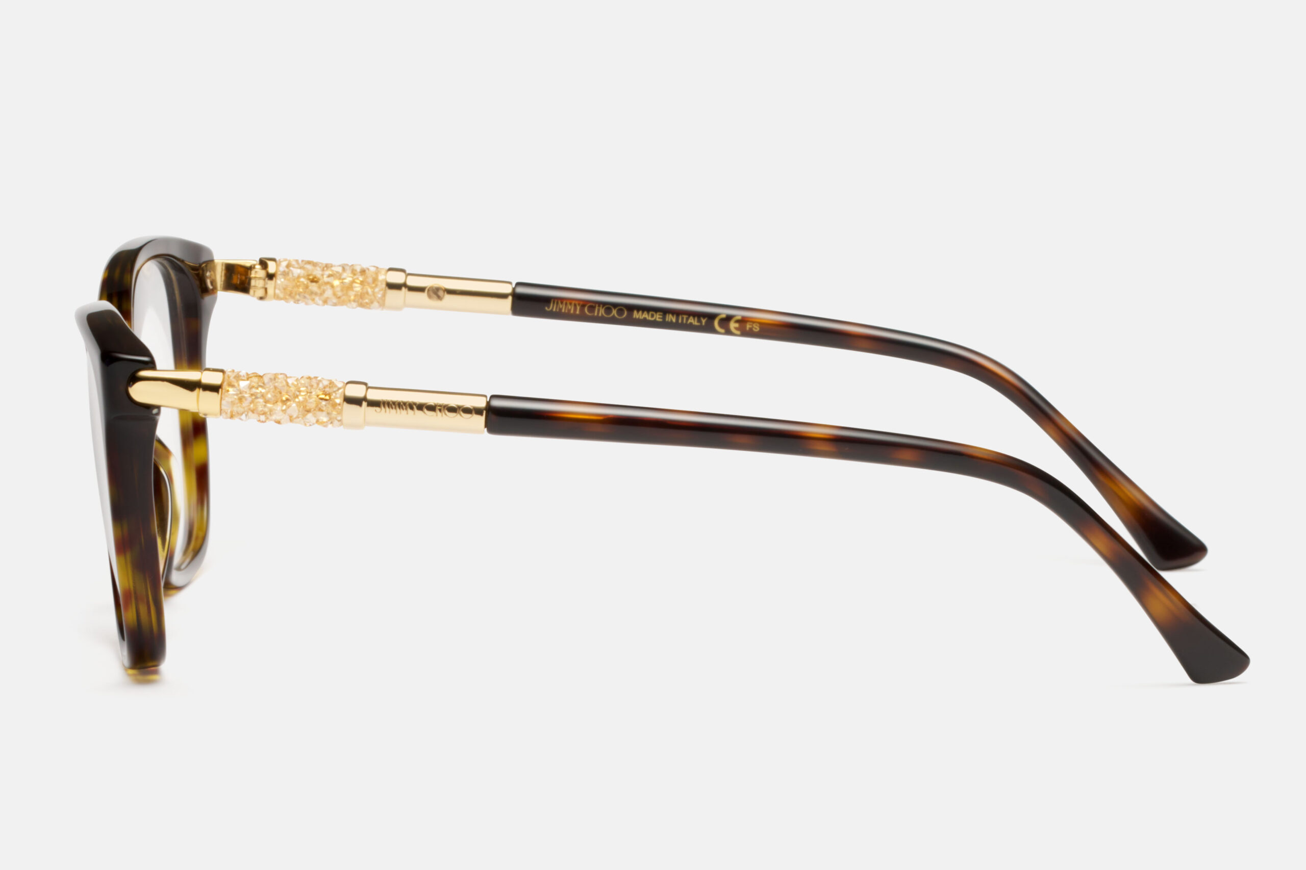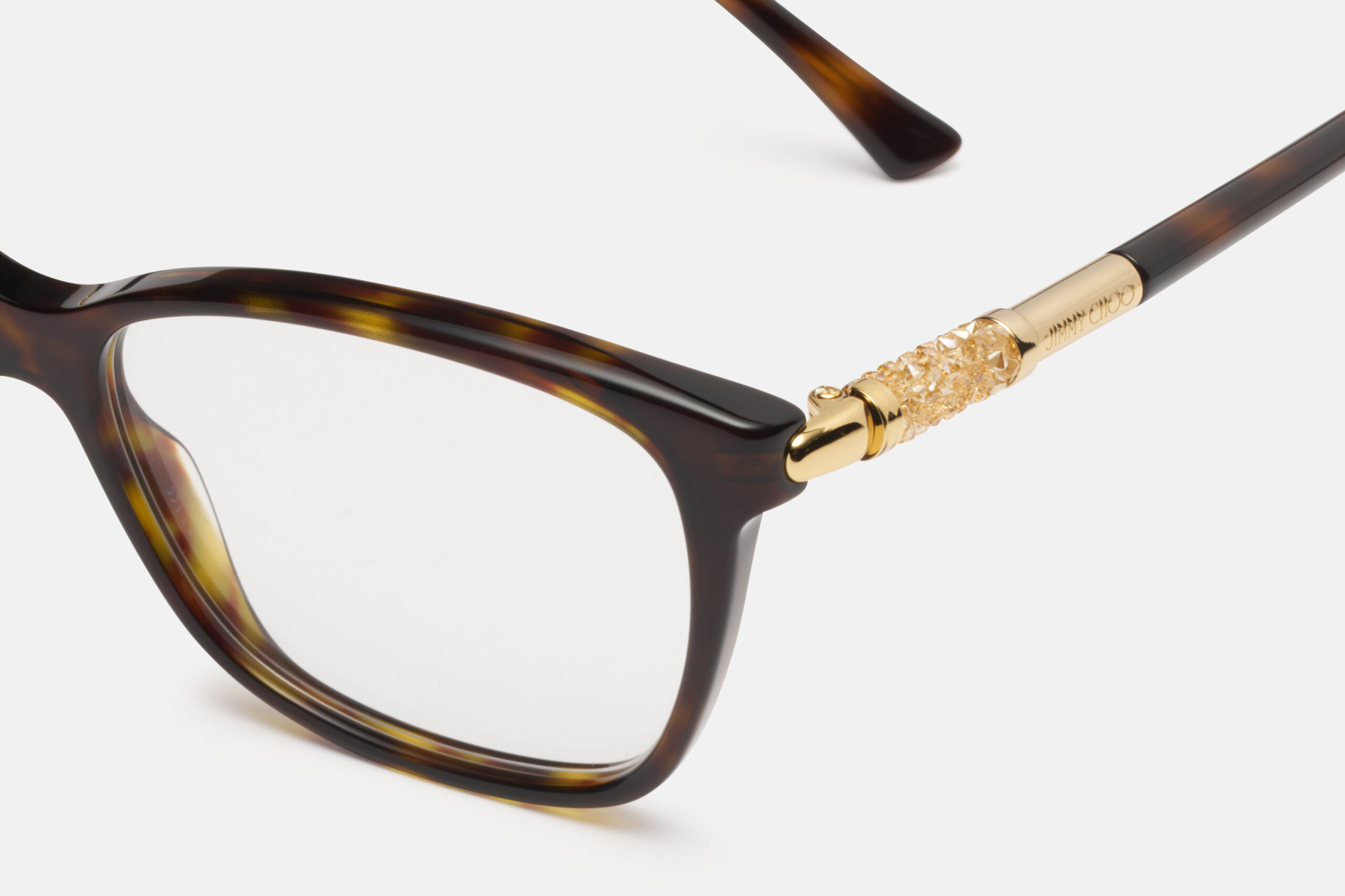 La montatura havana dalla forma squadrata conferisce equilibrio e carattere, mentre i terminali impreziositi aggiungono un tocco luminoso e sofisticato.